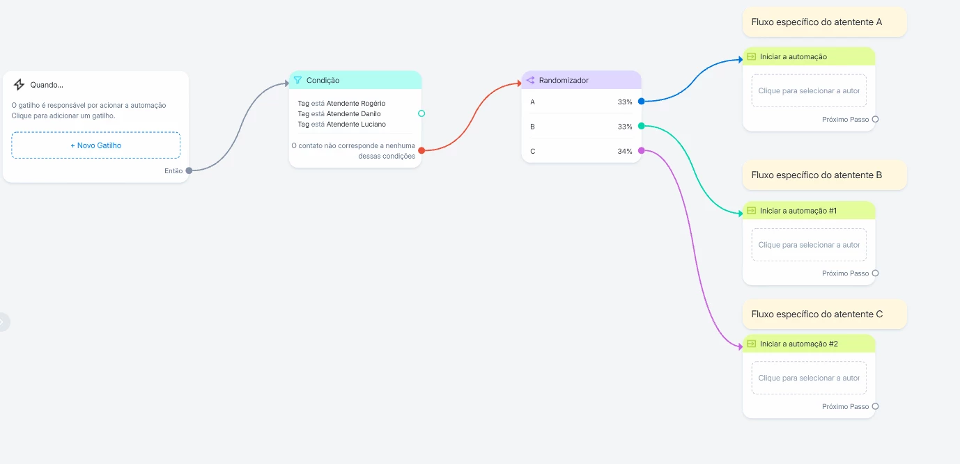 2 – Distribuição automática entre atendentes: Caso a distribuição entre os atendentes seja feita de forma automática, você pode configurar isso diretamente no fluxo de resposta padrão. Basicamente, cada atendente teria seu próprio fluxo de atribuição, como mencionado anteriormente. Quando um usuário entrar em contato, o fluxo verificaria se ele já possui a TAG de algum atendente. Se tiver, significa que ele já foi atribuído, e nenhuma ação será tomada. Se não houver nenhuma TAG de atendente, significa que é um usuário novo e, portanto, ele deve ser encaminhado a um atendente. Nesse momento, o fluxo seguiria para um bloco randomizador, que distribuiria os usuários de forma equilibrada entre os atendentes. Veja o exemplo na imagem abaixo: