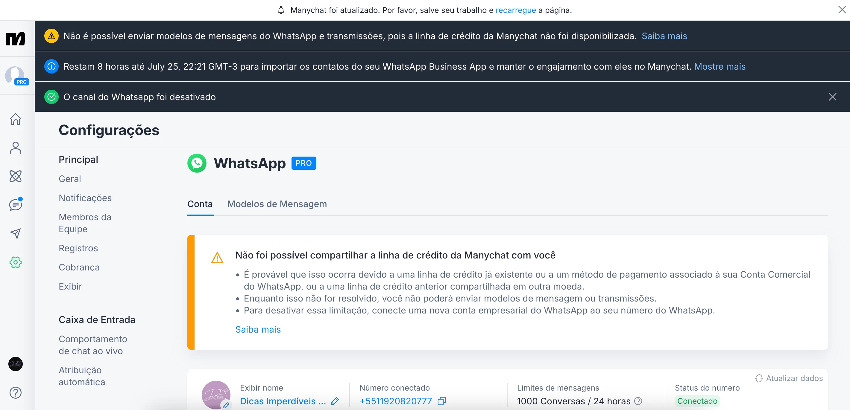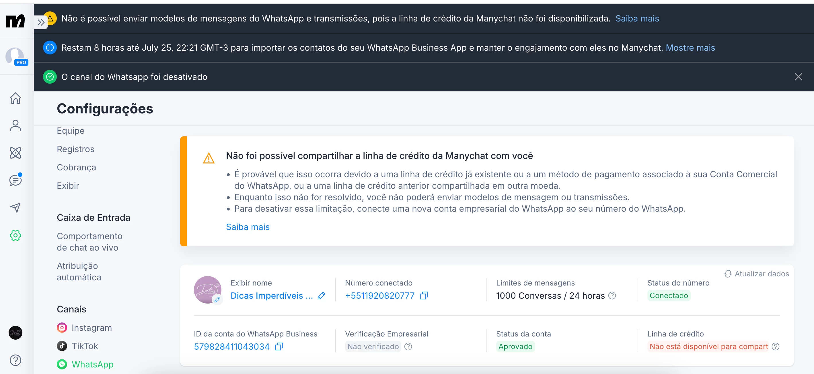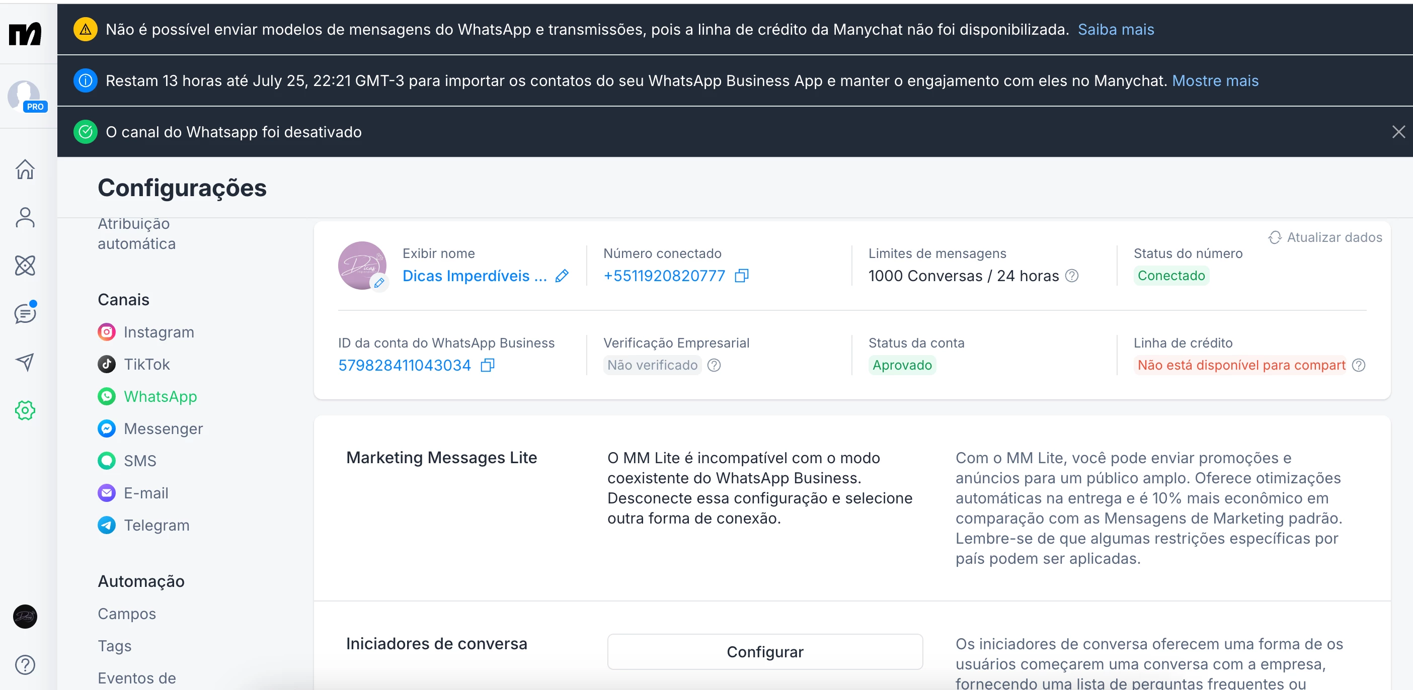 PS: tenho 2 telefones de Whatsapp business cadastrados no Meta, porem somente um esta atrelado ao Manychat (11) 92082-0777.
