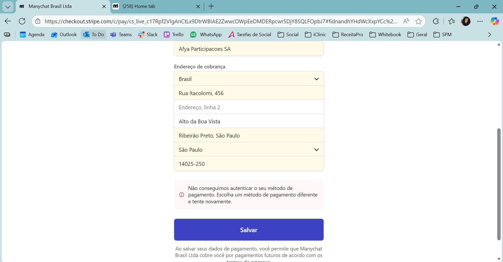 Ao renovar assinatura, tentamos cadastrar o cartão com moeda em real e o método de pagamento não foi autorizado. 1 mês depois, tentamos fazer renovação do pagamento com cartão em dólar. E a mesma mensagem apareceu.
