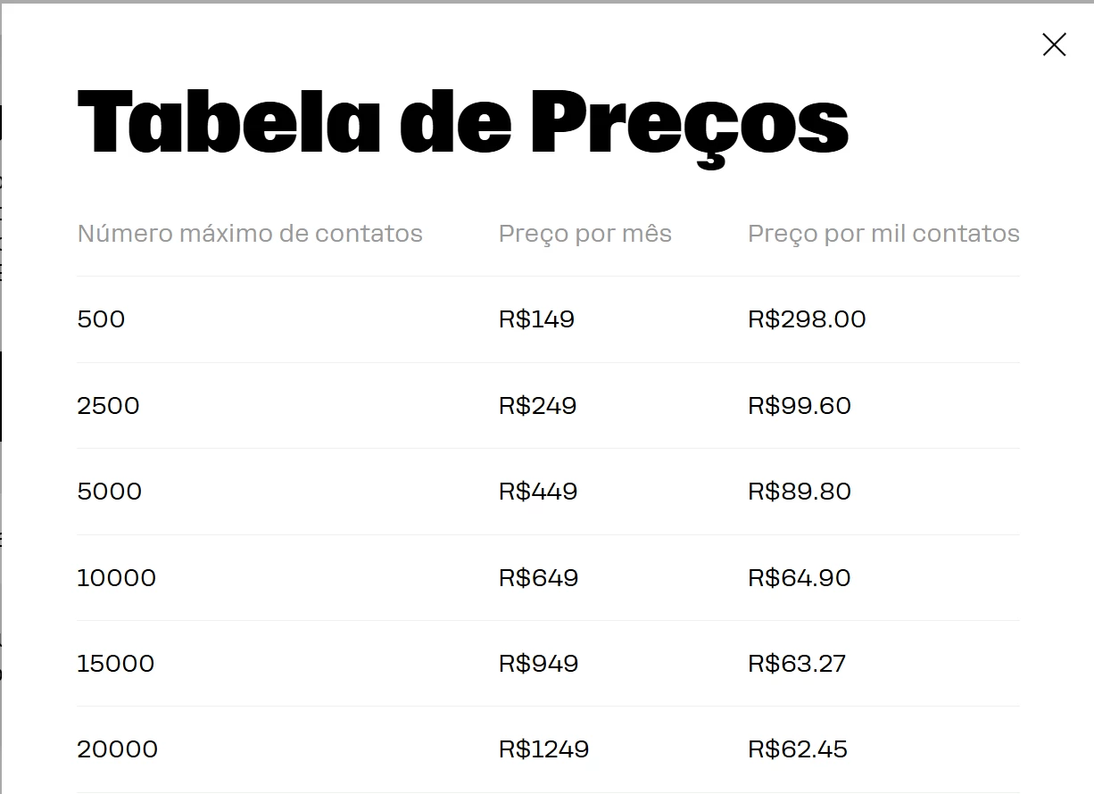 - Manychat cobra pela quantidade de contatos ativos em sua conta. Você pode consultar a tabela de preços em https://manychat.com/pt/pricing