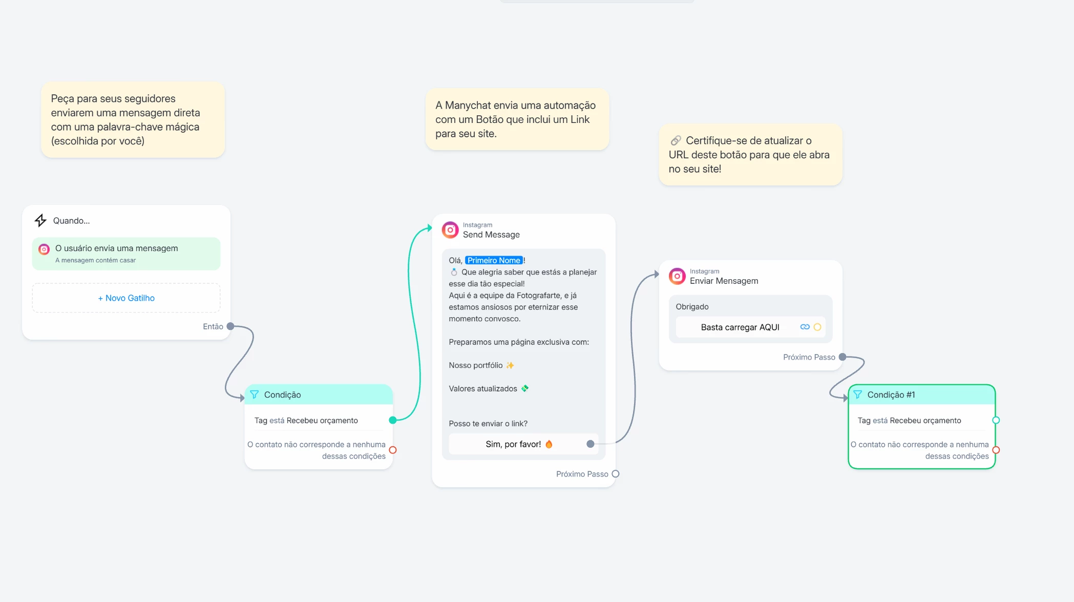 - Logo no início, insira um bloco de condição: "Este contato possui a TAG 'Recebeu Orçamento A'?"