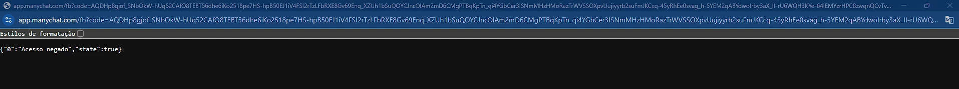 Estou recebendo a mensagem de erro {"0":"Acesso negado","state":true} ao tentar acessar minha conta ManyChat. O problema aparece ao abrir a URL de login/integração e a página não permite prosseguir. Já tentei limpar cache, usar outro navegador e reiniciar, mas o erro persiste.