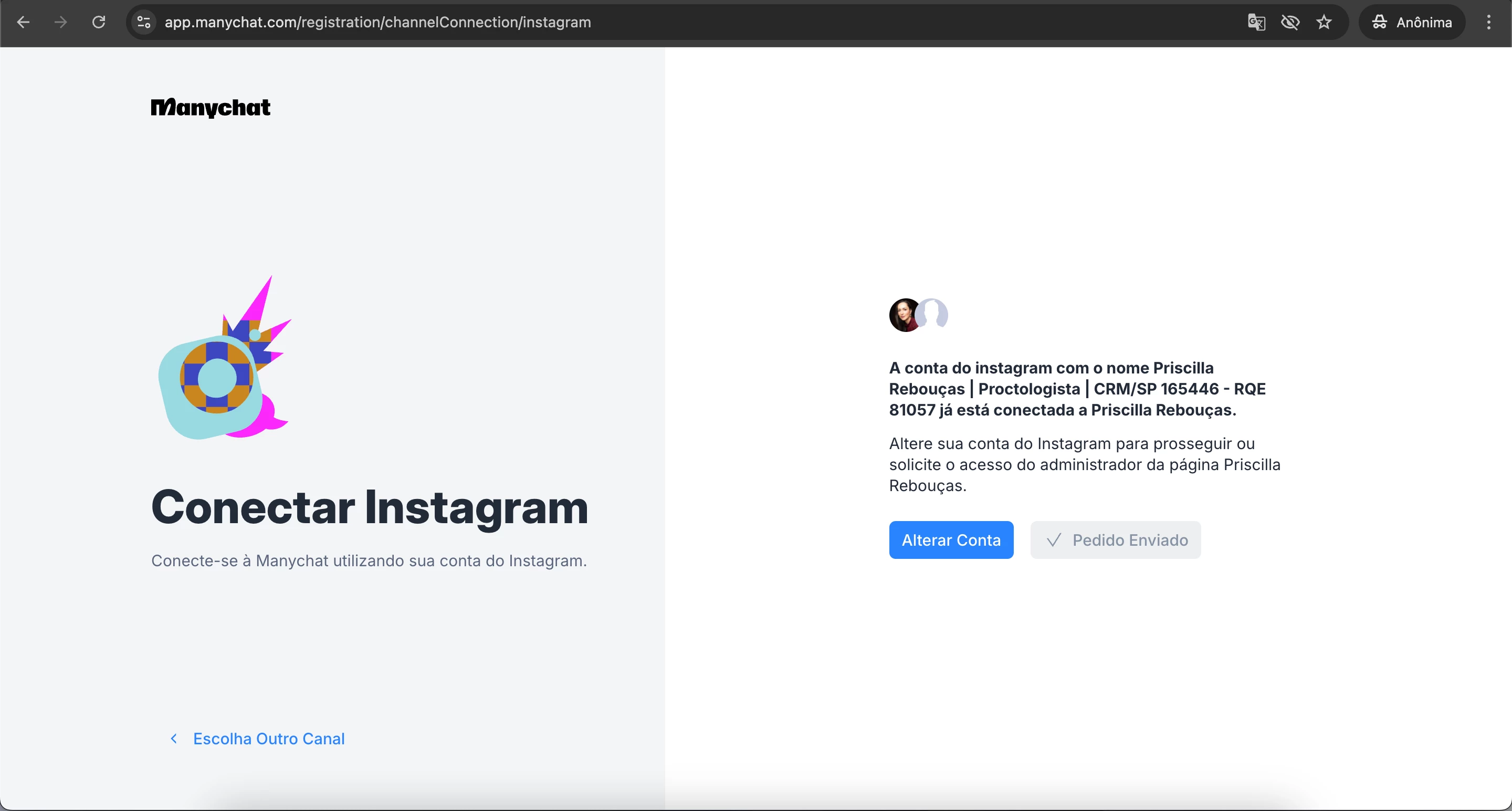 @drapriscillareboucas isso acontece quando já existe uma conta do Manychat conectada á tua conta do Instagram.