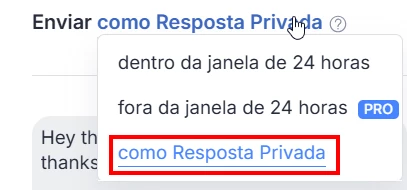 Sempre que você inclui um gatilho de reposta a um post/reel, o primeiro bloco de mensagem deve estar definido como Resposta Privada (em alguns lugares também pode aparecer como Resposta ao Comentário):