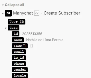 I create a flow in Manychat and I send some infos to Make using webhook. I did a schedule apointment in Make using google calendar, and now i want the flow to go back to manychat and continue the conversation but i just can’t do it. I saw a video on youtube and the options in manychat’s module‘create subscriber’ on make are diferent than mine. I only have access do User ID, the rest of ‘Data’ parameters does not exist.