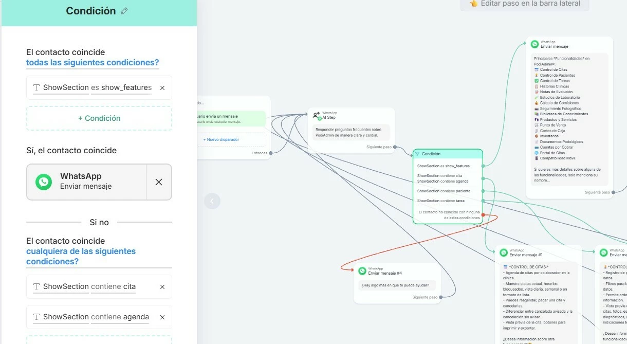 A continuación del Paso IA hay un bloque de condiciones, que su primera condición es “si ShowSection es igual a show_features”, y en la opción SÍ se ejecuta un bloque de texto con mi respuesta personalizada e imágenes, si la respuesta es NO, hay otras condiciones que conectan a otros bloques o regresan al Paso IA.