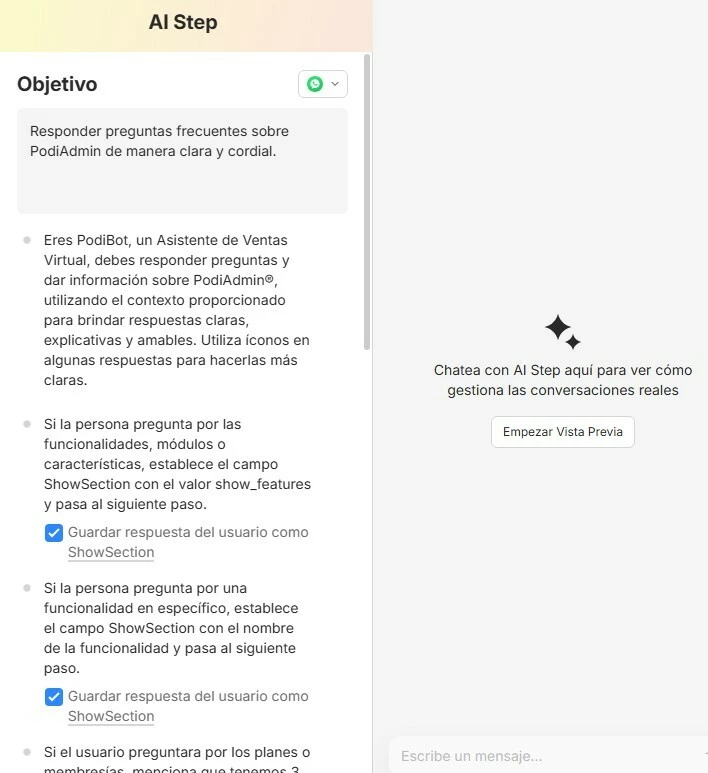 Tengo un Paso IA que tiene una tarea “Si la persona pregunta por las funcionalidades, aplica a la variable ShowSection el valor show_features y pasa al siguiente paso”. Tengo ya creada esa variable personalizada.