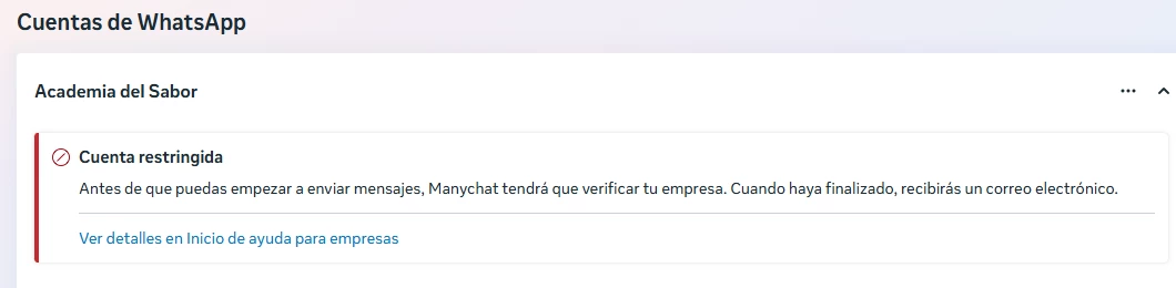 Siento mucho que tengas el bloqueo en tu cuenta. Usualmente esta advertencia de “Cuenta restringida” no es un bloqueo de Manychat sino una medida aplicada por Meta a tu número de WhatsApp Business.
