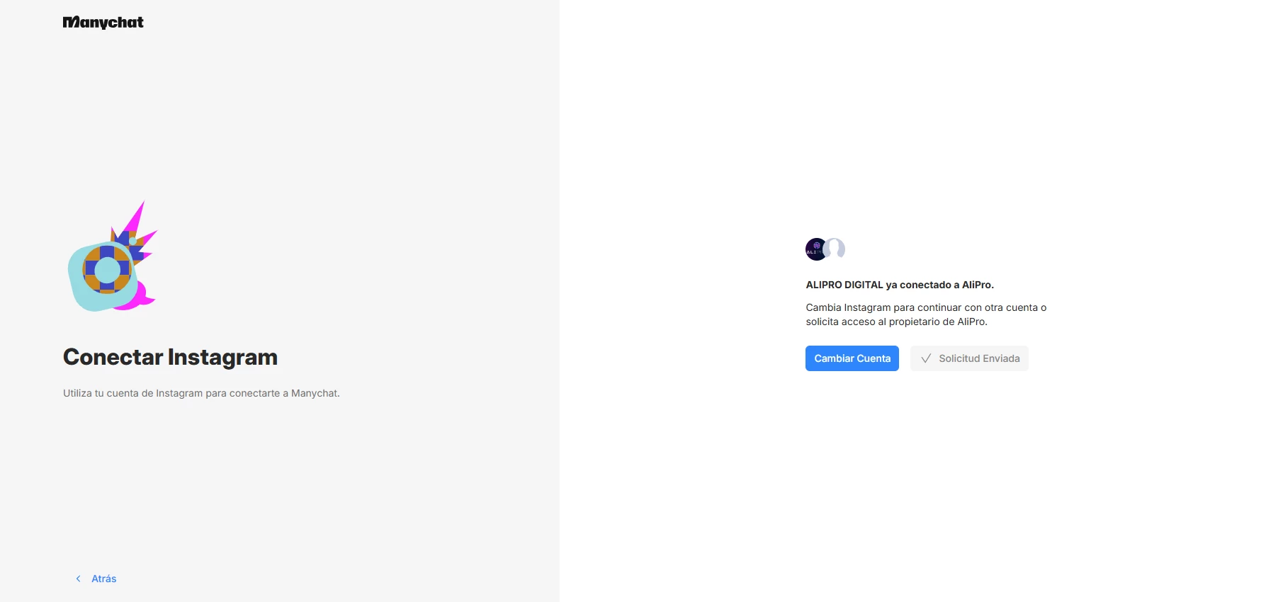 **ACTUALIZACION** le puse conectar solo con Instagram y se “conectó” pero me sigue sin aparecer la cuenta en ManyChat. Y habla de que enviaron una solicitud. Una solicitud a dónde?