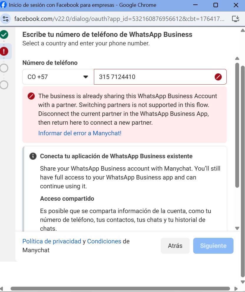 Cuando trato de vincular Manychat a mi whatsapp bussines con coexistencia me aparece el siguiente error: