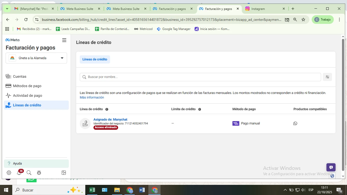Estoy teniendo un problema con mi cuenta de Meta Business Suite: aparece una línea de crédito asignada por ManyChat (ID del negocio: 711214052401794) que muestra el estado “Acceso eliminado”, pero sigue activa y me impide integrarme con otro proveedor.