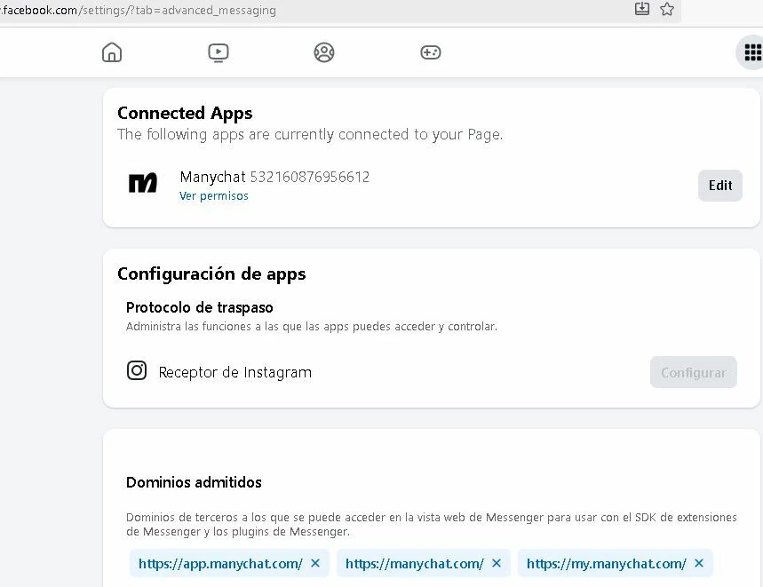 - En mi página de Facebook Business → Configuración de la página → Mensajería avanzada → no aparece manychat, solo aparece instagram y no sé como quitar Instagram para agregar manychat.