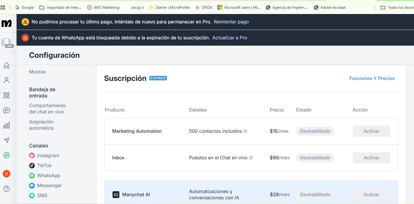 Pues si observamos tu screenshot, el plan PRO aparece como USD 15, pero para llegar a los USD 44 que se están cobrando, se puede entender que los USD 29 de la Manychat AI están siendo añadidos en la factura...